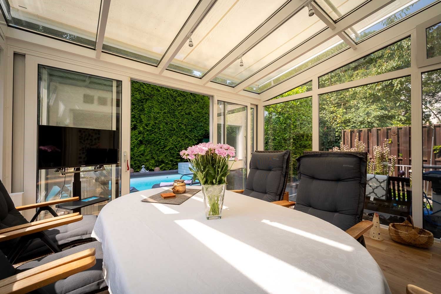 Das Erste, womit ich gerne prahle: Ich habe einen eigenen beheizten Pool! Ja, richtig gehört. Während andere Häuser neidisch über den Gartenzaun schauen, planschen meine Bewohner ganz entspannt. Und wenn es draußen kühler wird, kuscheln wir uns in meinen beheizten Wintergarten ein. Dort ist es gemütlich warm, während draußen der Wind pfeift.