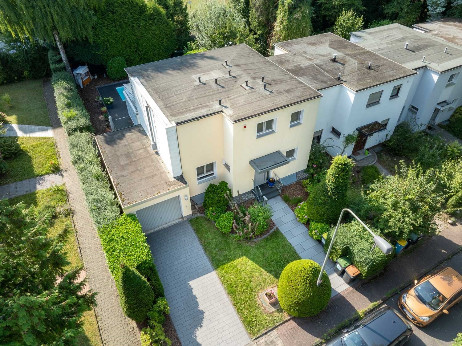Auf meinem 387 m² großen Grundstück befindet sich mein Pool, meine schöne Terrasse und jede Menge Grün. Ich habe eine Garage und einen Stellplatz. Praktisch, oder?